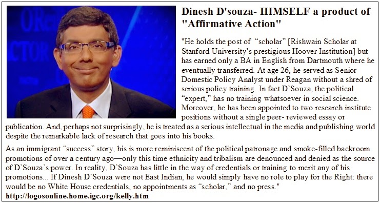 Finally D'Souza himself seems a beneficiary of "affirmative action" - the same 'special treatment' he never ceases to bash black scapegoats for. He was appointed "scholar" at prestigious Hoover Institute at Stanford for example, despite having no serious scholarly publication, or peer reviewed article published, and only having a BA in English. He was appointed president of prestigious private Kings College despite no experience in academic administration, or ministry. As one detailed analysis notes: